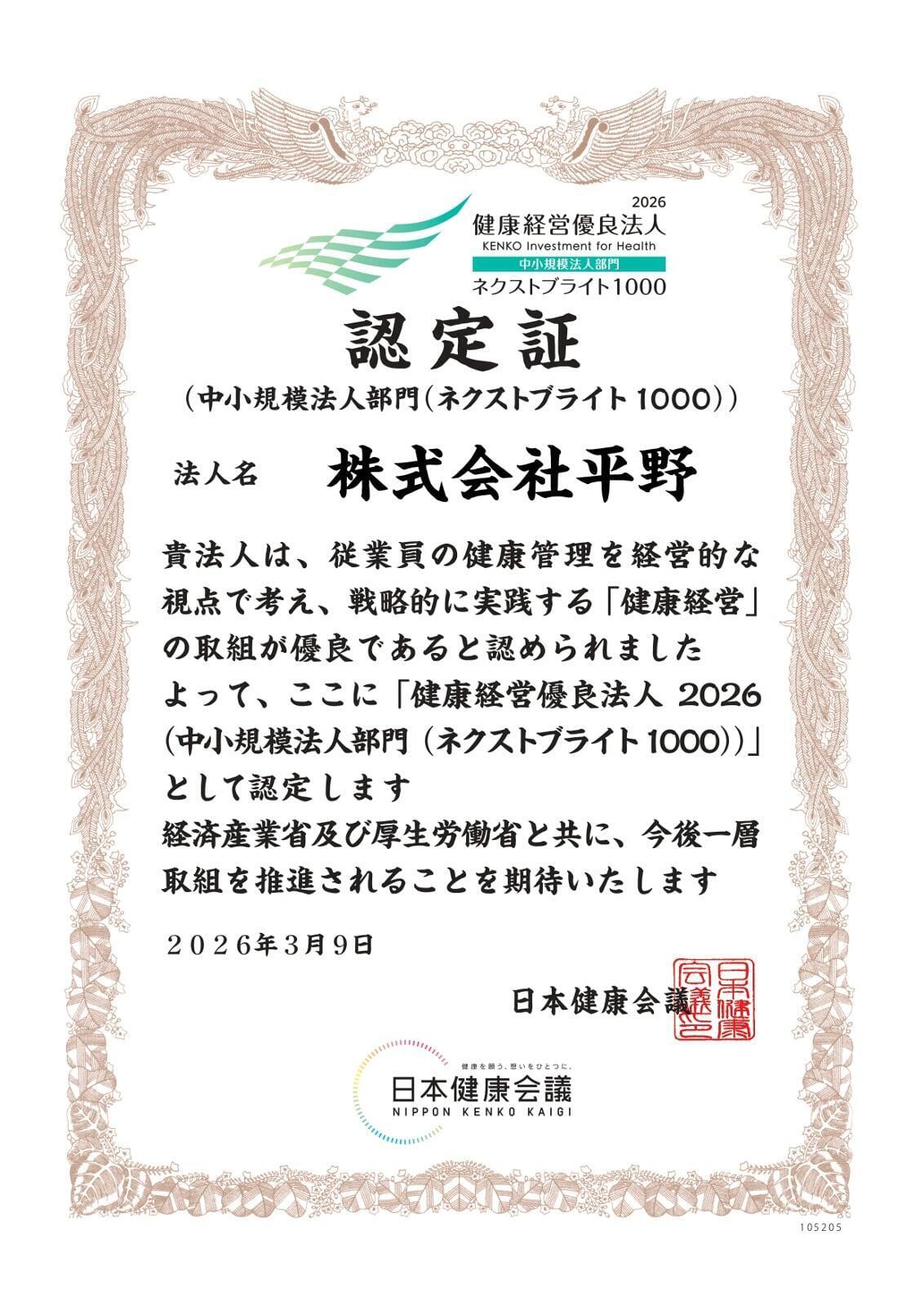 昨年に引き続き、健康経営優良法人中小規模法人部門のネクストブライト1000に